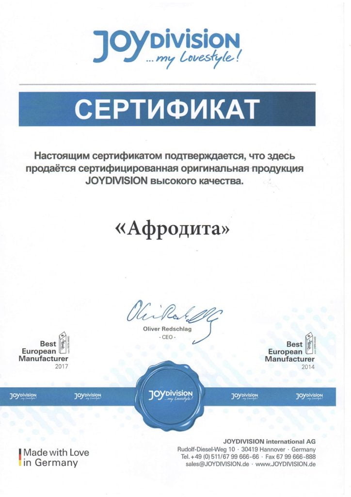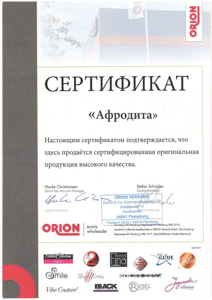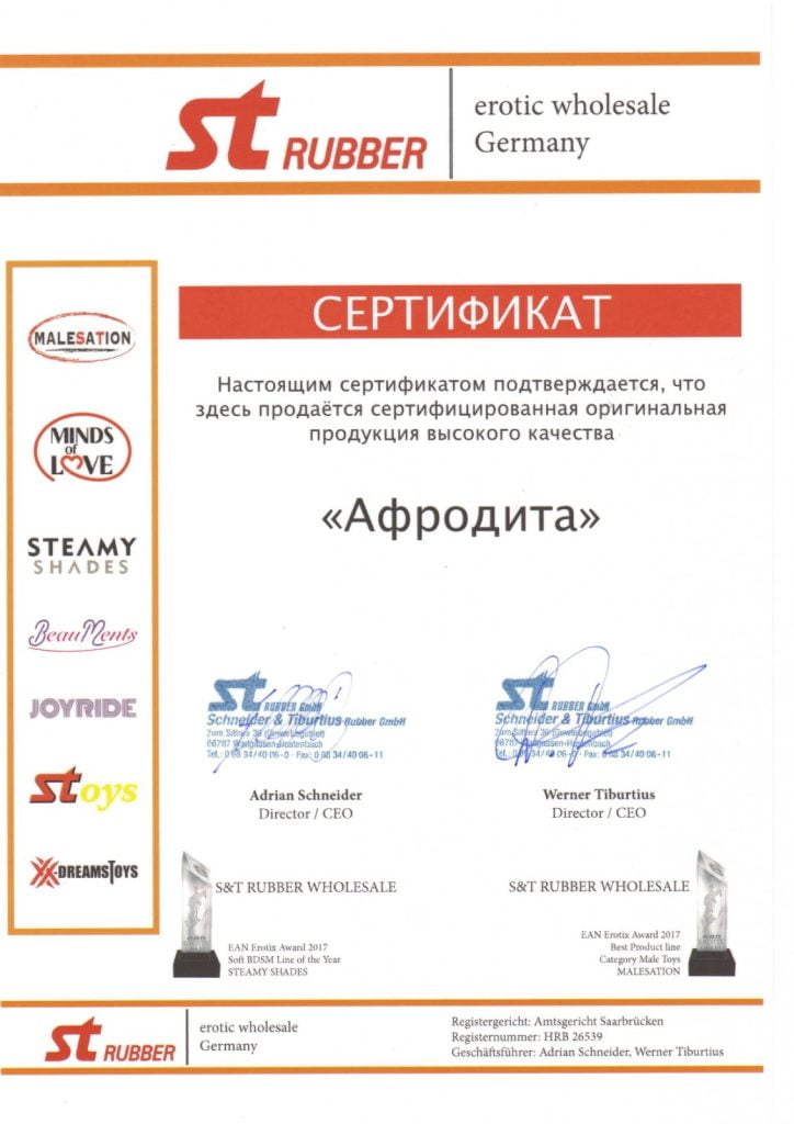 Тільки в нашому інтим магазині, всі товари пройшли сертифікацію для продажу на території України. Для того щоб наші покупці були впевнені, що вони купують дійсно кращу продукцію, ми представляємо дилерський сертифікат по кожній нашій торговій марці.